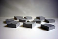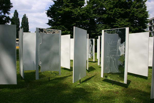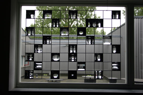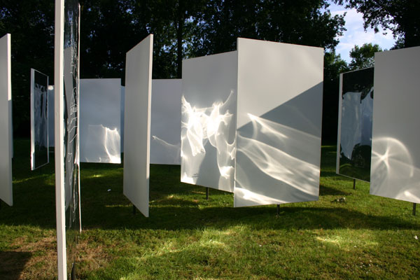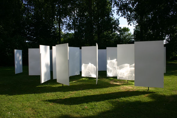 Installatie van ronddraaiende panelen die in een raster staan. Door te draaien ontstaan steeds wisselende ruimte's.